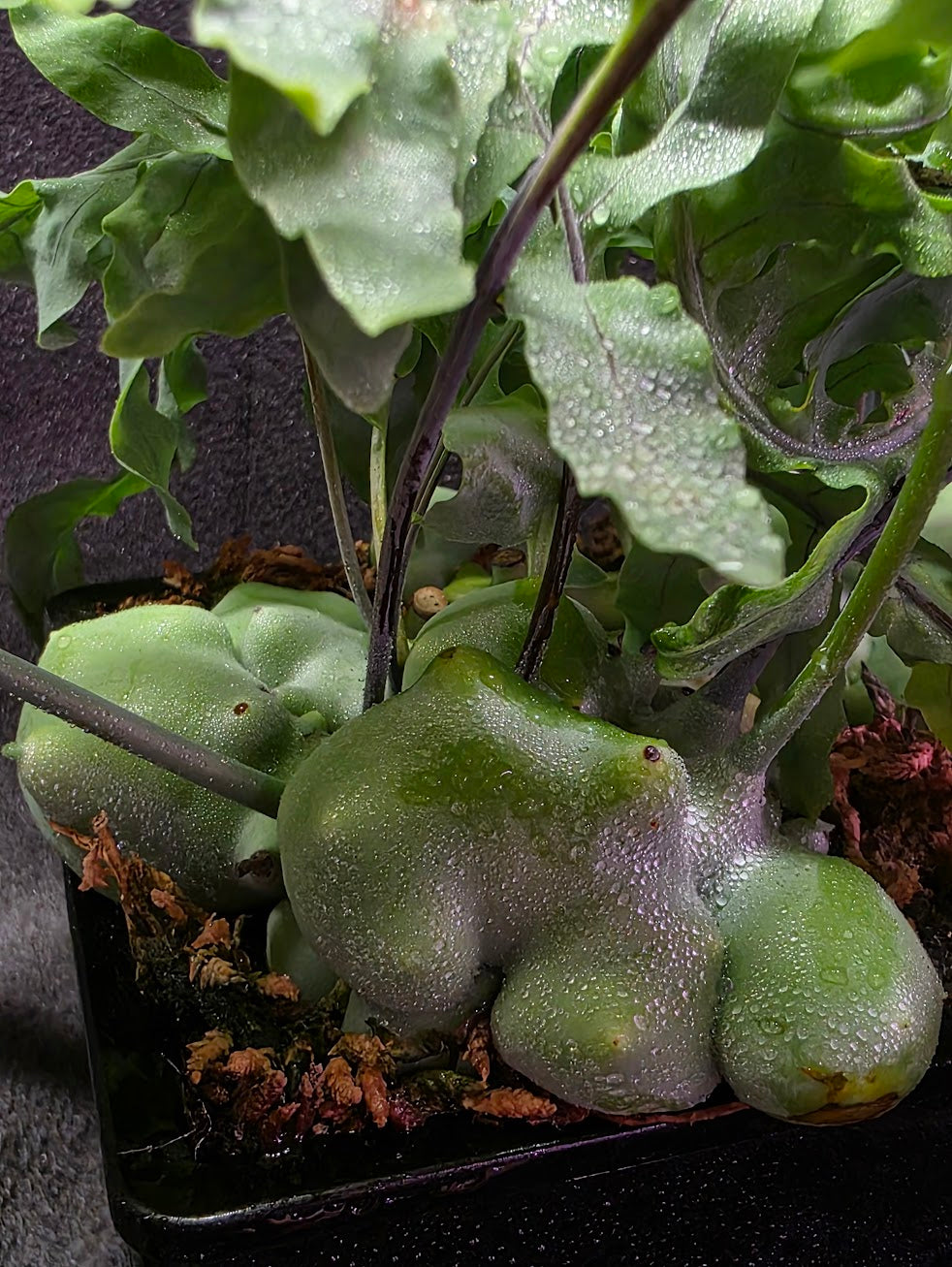 Lecanopteris deparioides, commonly known as the Blue Ant Plant, is an extraordinary and rare ant-ferning epiphyte prized for its sculptural rhizomes, metallic blue-green fronds, and fascinating symbiotic biology. This species is native to the humid forests of Southeast Asia, where it grows attached to trees and develops swollen, hollow rhizomes that naturally shelter ant colonies in the wild. These thick, glossy, golden-green rhizomes form beautiful, twisting structures that look almost reptilian—an architectural focal point that instantly elevates any terrarium or rare plant collection. Although the plant can host ants in nature, it does not require them in cultivation, instead thriving happily as a uniquely ornamental houseplant.