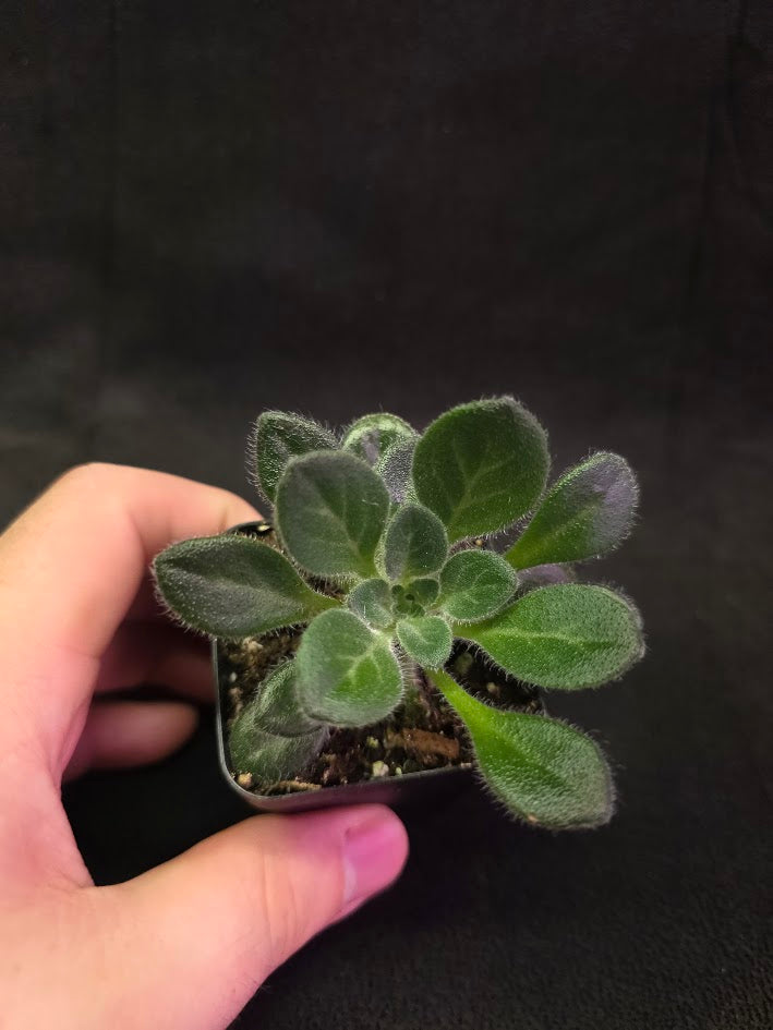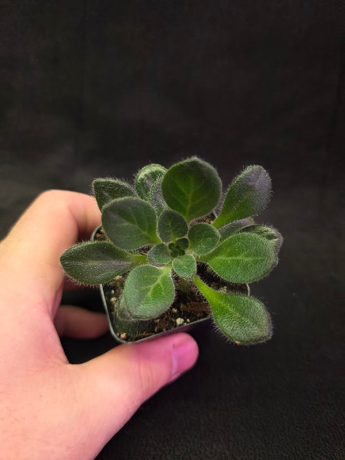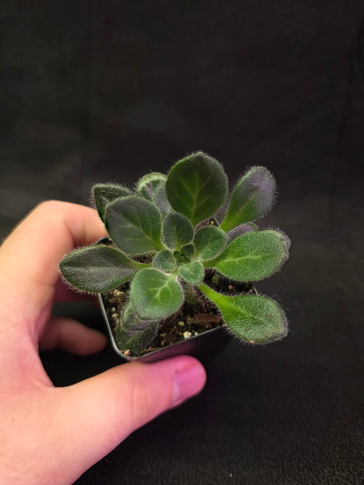 The Primulina USBRG 98-083 – Singapore is a rare and highly collectible gesneriad known for its refined foliage and compact, rosette-forming growth. Its leaves are typically elongated and slightly textured, showcasing deep green tones with subtle silvery or bluish highlights that catch light beautifully, giving the plant an elegant, almost sculptural presence. Each leaf grows from a tidy central rosette on short petioles, creating a dense, compact plant ideal for terrariums, display cabinets, or curated indoor collections. Fine reddish or purplish stems add a gentle contrast, enhancing the overall visual appeal and highlighting the plant’s tropical origin.