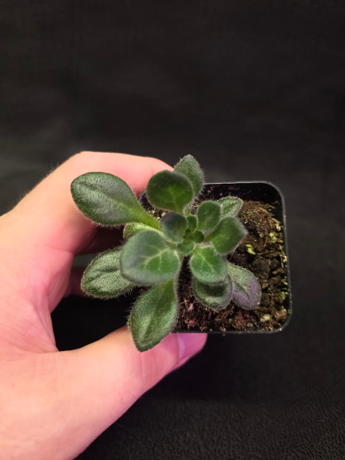 The Primulina USBRG 98-083 – Singapore is a rare and highly collectible gesneriad known for its refined foliage and compact, rosette-forming growth. Its leaves are typically elongated and slightly textured, showcasing deep green tones with subtle silvery or bluish highlights that catch light beautifully, giving the plant an elegant, almost sculptural presence. Each leaf grows from a tidy central rosette on short petioles, creating a dense, compact plant ideal for terrariums, display cabinets, or curated indoor collections. Fine reddish or purplish stems add a gentle contrast, enhancing the overall visual appeal and highlighting the plant’s tropical origin.