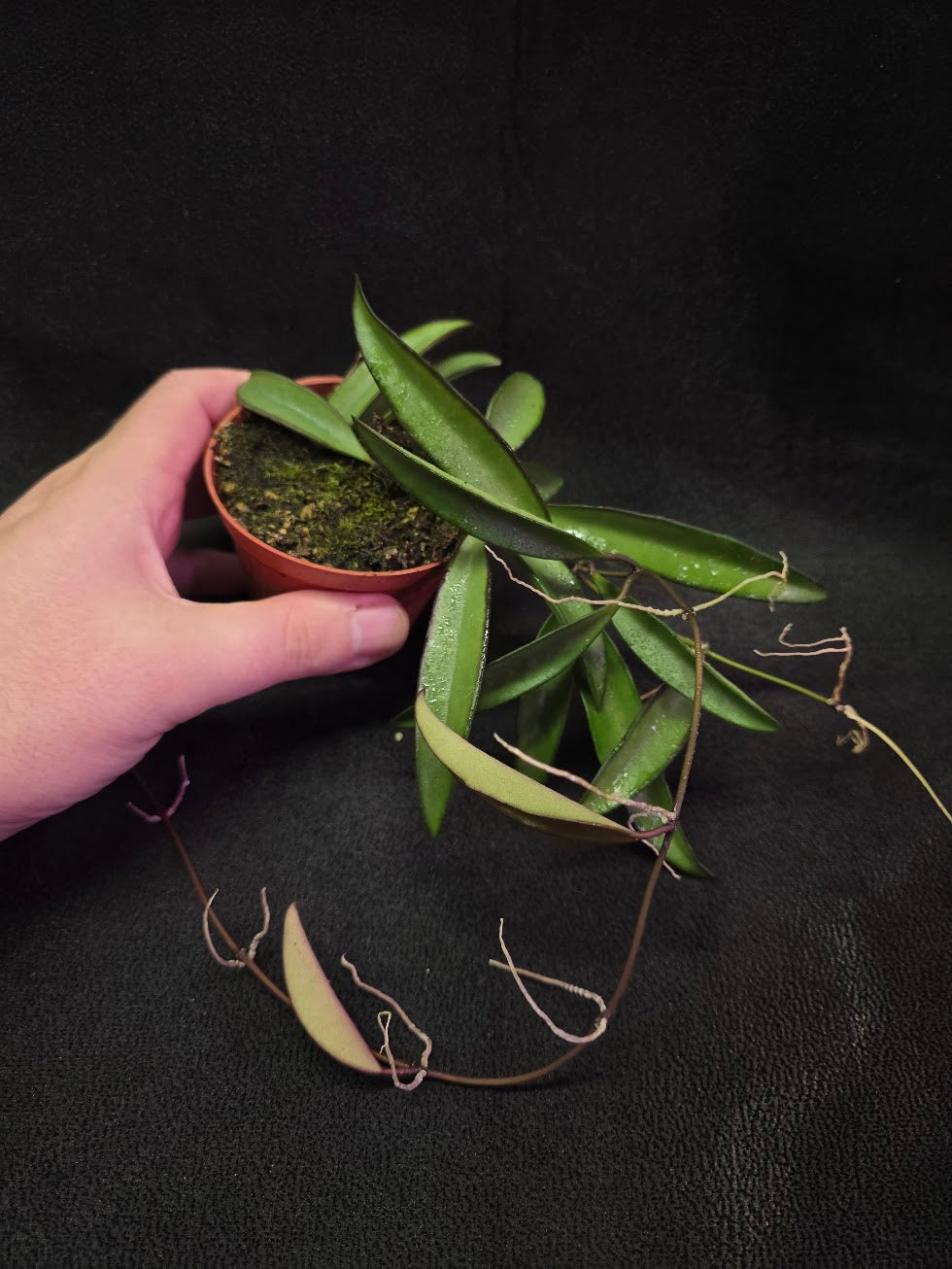 The Hoya wayetii is a striking and elegant vining houseplant prized for its narrow, elongated leaves and deep contrasting margins that give it a truly exotic presence in any collection. Native to the tropical regions of the Philippines, this Hoya thrives in warm, bright environments where its foliage can develop its signature dark, almost burgundy edges—especially when exposed to higher light. Each leaf is slightly curved, leathery in texture, and hangs gracefully along firm trailing vines, making this species a popular choice for hanging baskets, shelf displays, or modern plant walls. As the plant matures, it produces cascading strands that can grow impressively long, creating a full, lush appearance that adds dimension and movement to any space.